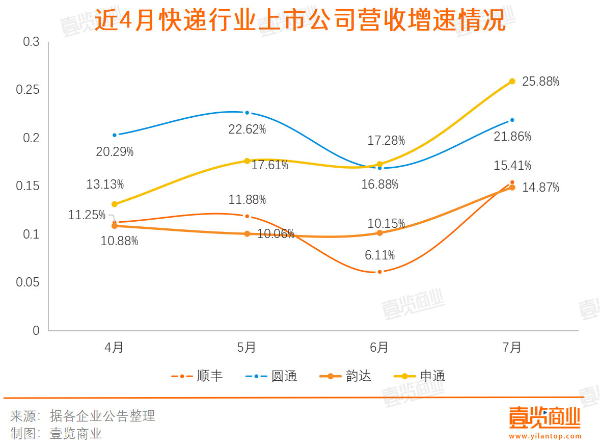 壹览商业统计发现,包括顺丰、圆通、韵达、申通在内的四家已上市快递公司,近四个月营收几乎都有同比两位数的增长。其中,申通在7月同比增速最快,达到25.88%。