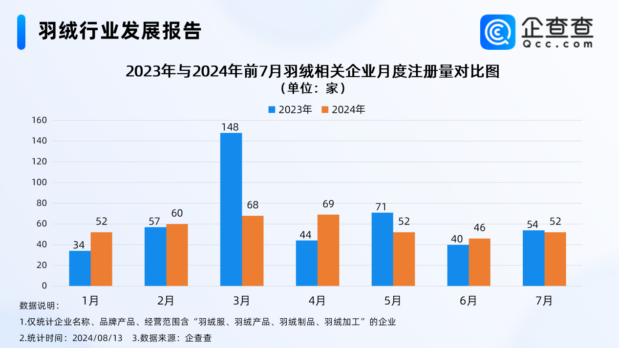 根据企查查数据显示,国内现存羽绒相关企业4.95万家。2023年全年注册857家相关企业,主要集中在3月、9月。截至目前,今年已注册412家相关企业,其中前7月注册399家,月度注册量分布较为均匀,基本保持在50家—70家的区间内。