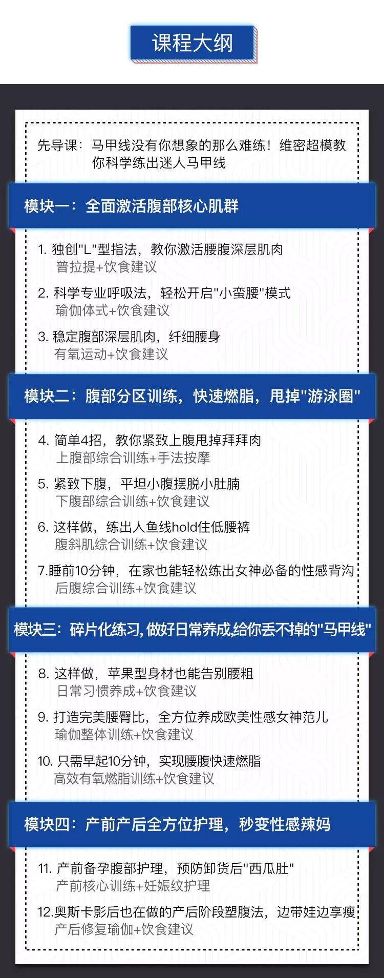现在赶快行动起来,瘦出人人羡慕的马甲线并不难,大家一起来看看这个打磨半年已久的课程大纲,即便是懒癌、吃货也能爱上!精心设计,诚意十足!