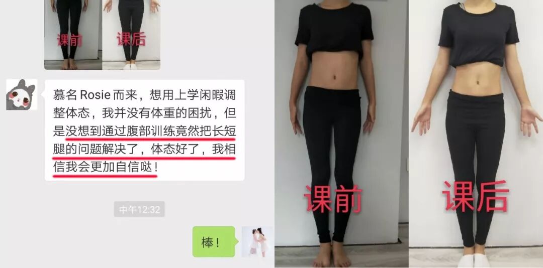 3. 例如广州的碧初和Rosie分享近月在家训练完的腹部对比图,“谢谢老师,现在腰变细了,小腹不再那么圆鼓鼓,跨也变窄了,每天一起床都感到精神满满啊~”
