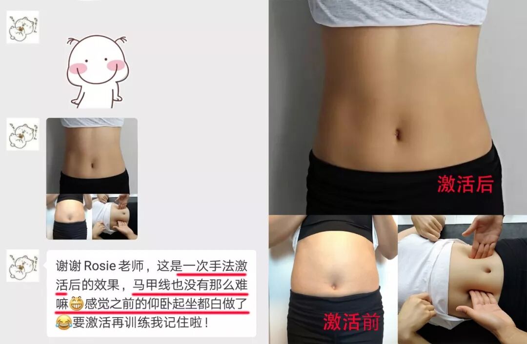 1. 例如25岁的白领豆豆,仅做了一次手法激活,马甲线已经隐约可见,还感叹一句“马甲线也没有那么难练嘛,以往的仰卧起坐都白做了”。