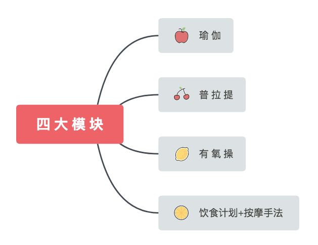 瑜伽、普拉提、有氧操、健康饮食四大模块