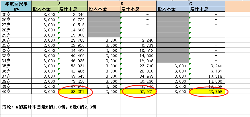 不仅如此,婉婉还明白了,同样是3000块本金,同样的年收益率8%,都是在40岁时停止投资,A、B、C三位分别在25岁、30岁、35岁开始投资,最后A女士取现时拥有的钱是B的1.8倍,B是C的2.3倍。