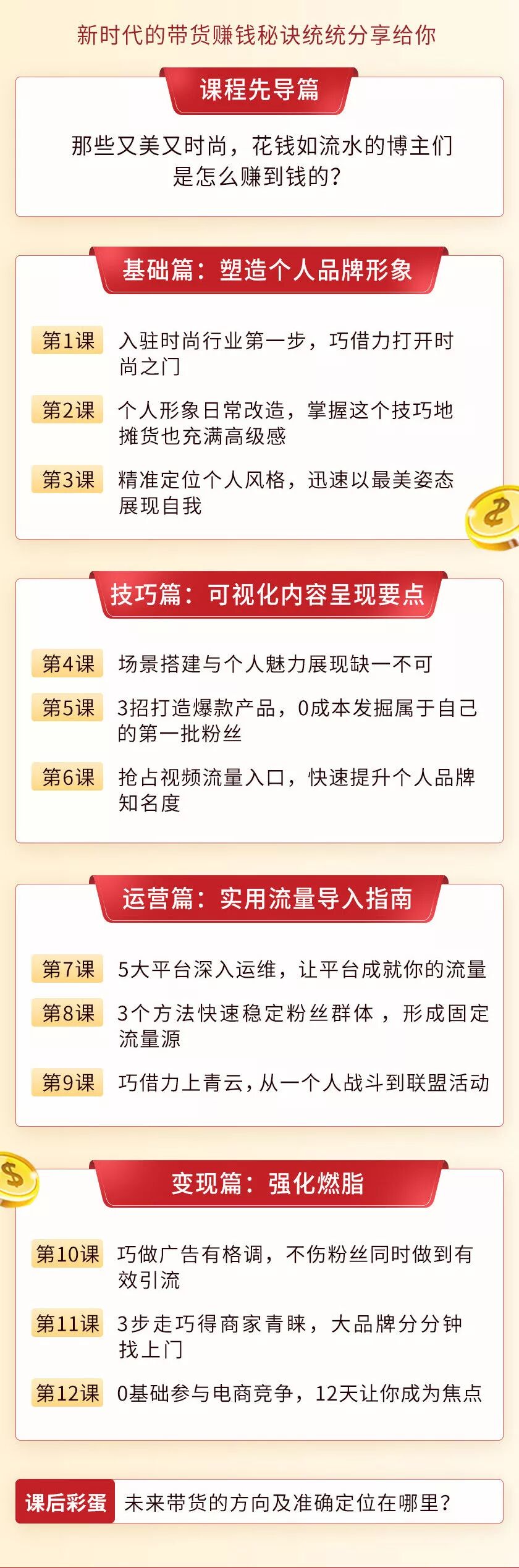 更重要的是,在课程的后半部分,左案潇老师将从粉丝变现+品牌变现+电商变现来为大家解析可持续赚钱的秘籍,成功打开你的变现之路。