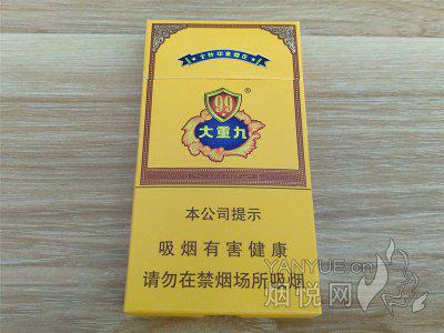 包装特点:秉承云烟传统尊贵典雅和大重九系列简洁、醒目的风格,分别以黄色和浅黄色为主色调,点缀红蓝相配的重九经典标识,以先烫后印的工艺,表达出古典式的尊贵,突显百年重九经典风范。商标采用三维全息防伪技术和二维码防伪技术结合,独具魅力的接装纸一体化设计以及双重压纹铝箔纸的搭配,更具尊贵不凡的气质。