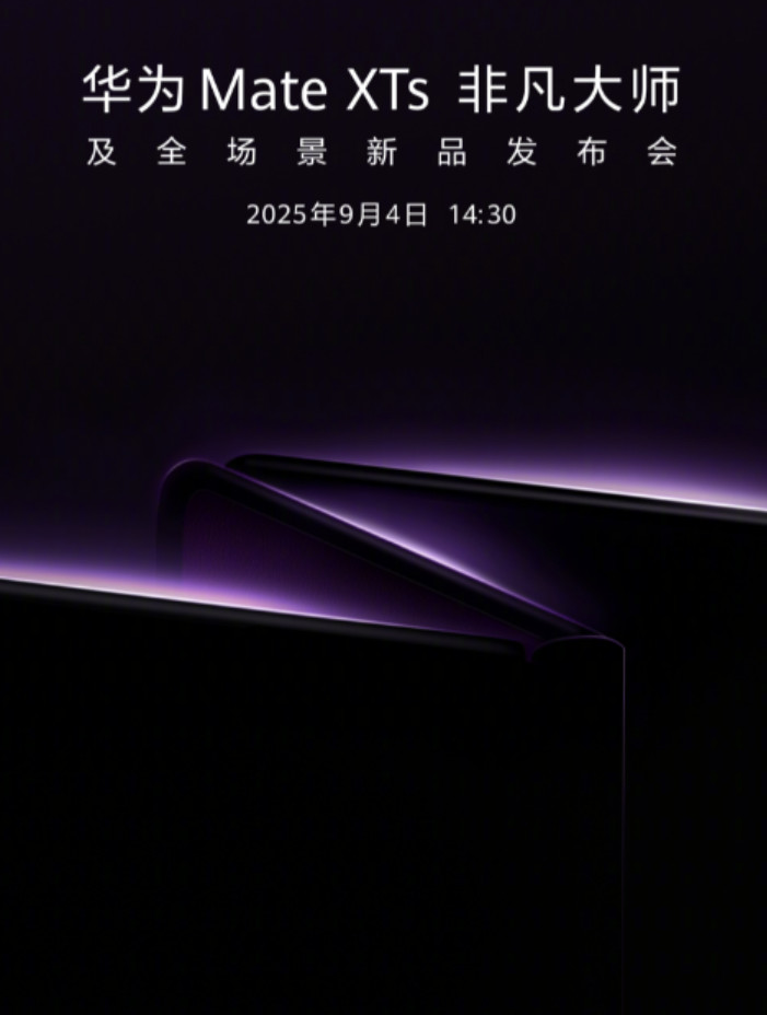 华为官宣将于9月4日举办华为Mate XTs 非凡大师及全场景新品发布会,发布新款华为三折叠屏手机。搭载升级的影像系统、电池与处理器,并有望成为国内首款支持 eSIM 的手机。该发布会可能还包含全场景生态新品。