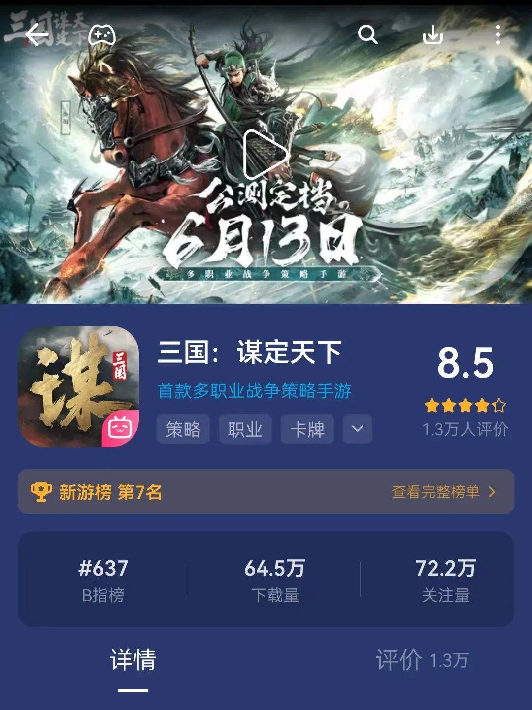 6月13日,B站独家发行的一款SLG(战争策略)游戏《三国谋定天下》开放公测,当日便冲上国内游戏免费总榜第二、畅销榜第四。目前,“三谋”在B站评分8.5分,位列新游榜第7、热度榜第19名。