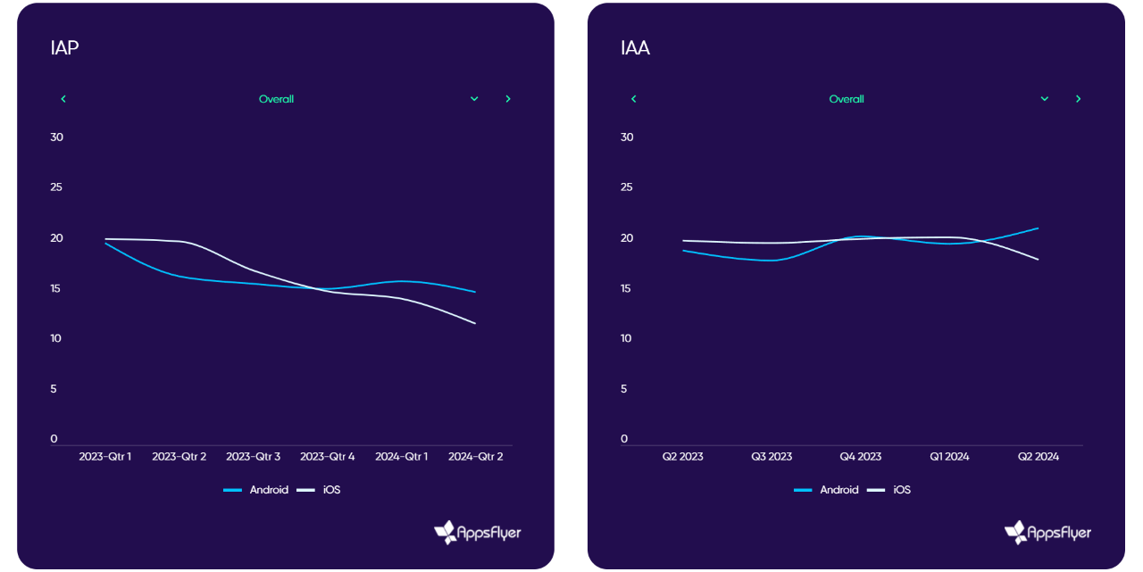 从变现模式来看,根据 AppsFlyer 的数据显示,2024年上半年,全球手游市场双端 IAP 整体走低,安卓端同比下降15%,iOS 端下降35%。但另一方面,尽管 IAA 在 iOS 端下降10%,但在安卓端却提升了12%,其中超休闲、解谜、模拟类涨幅明显。这也说明,目前休闲类 IAA 手游在广告变现上表出更强的韧性和增长潜力。