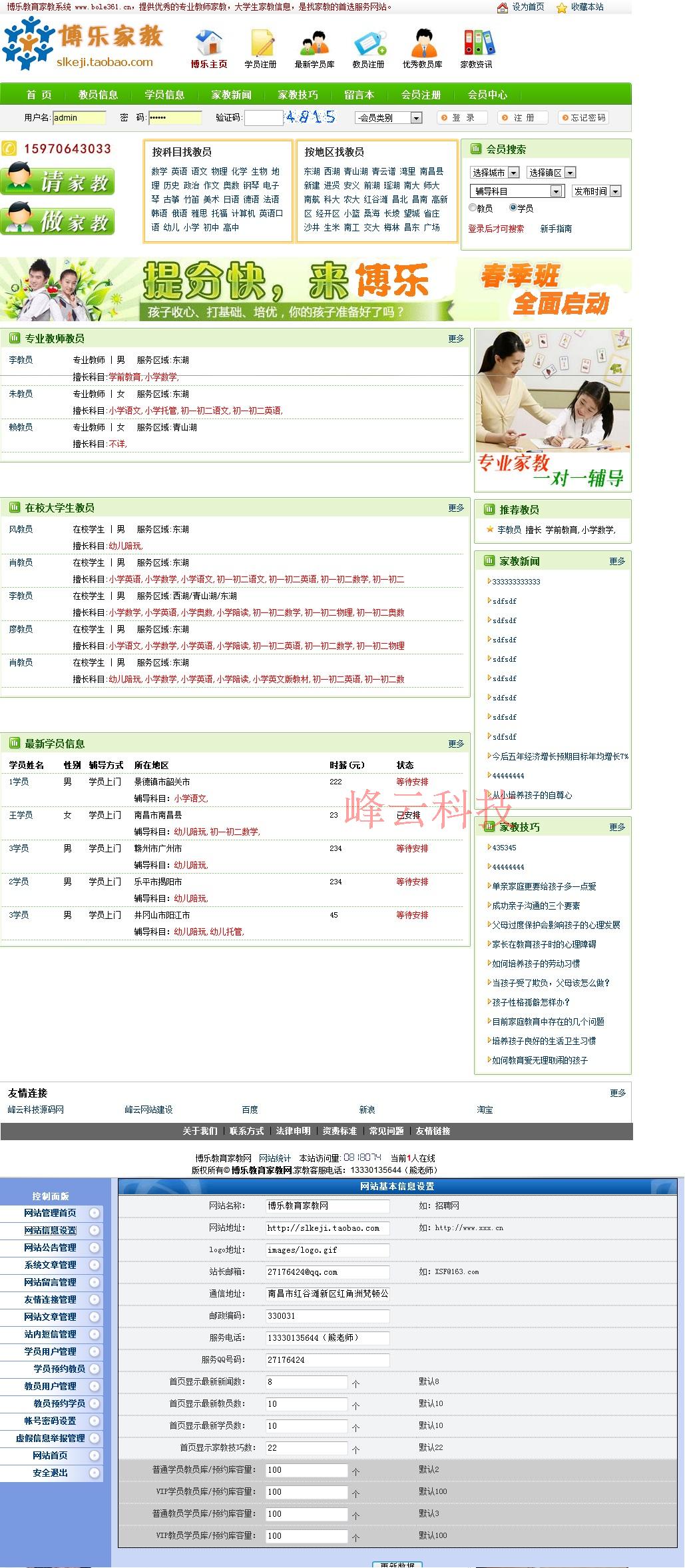 后台功能:教员注册管理,学员注册管理,会员搜索,会员等级管理,学员库,教员库,站内短信,留言本,新闻管理,学员预约管理,教员预约管理,在线咨询管理,友情链接管理等。