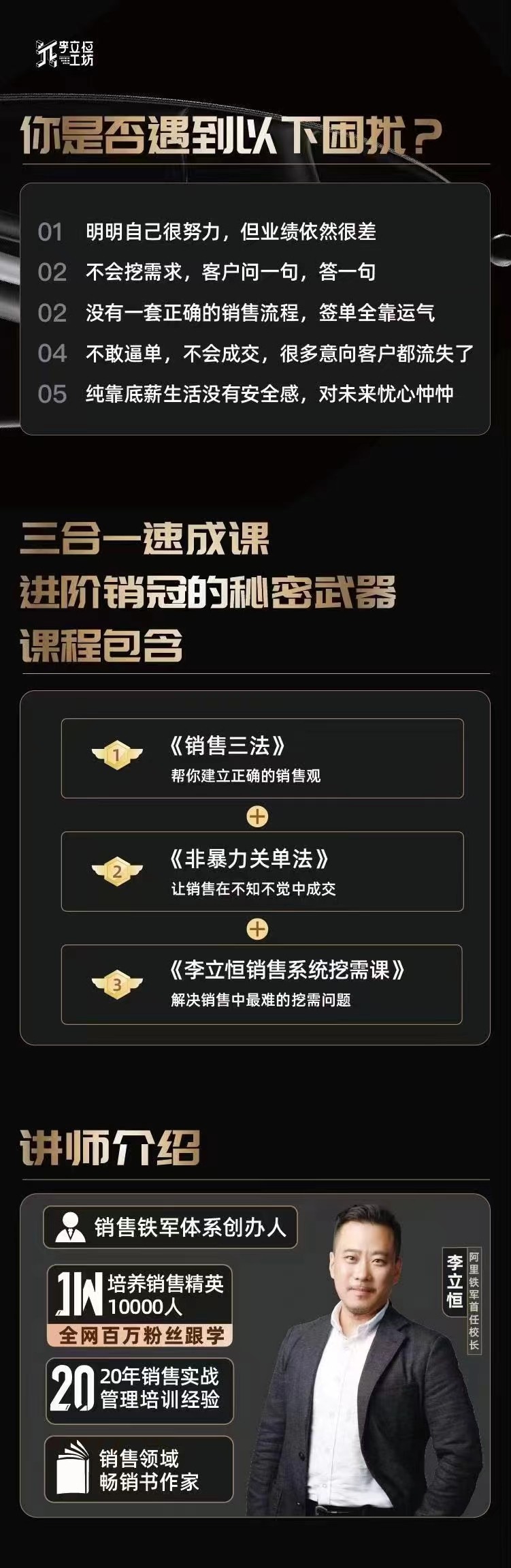 李立恒从小白到销冠 三合一速成:销售三法+非暴力关单法+销售系统挖需课 (27节)资源简介: