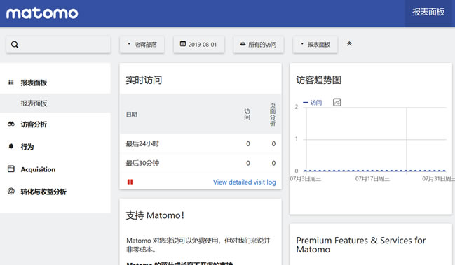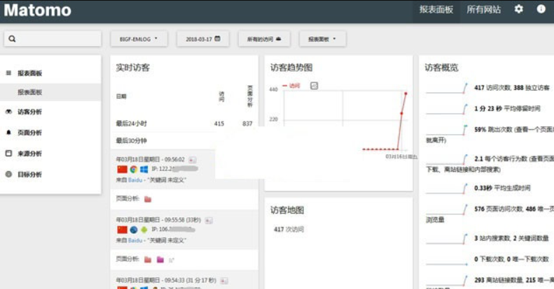matomo网站统计系统(之前叫Piwik)是一套基于PHP5+MySQL技术构建的开源网站访问统计系统,前身是phpMyVisites。Piwik可以给你详细的统计信息,比如网页浏览人数,访问最多的页面,搜索引擎关键词等等流量分析功能。此外,它还采用了插件扩展及开放API架构,可以让用户根据 自已的实际需求创建更多的功能。