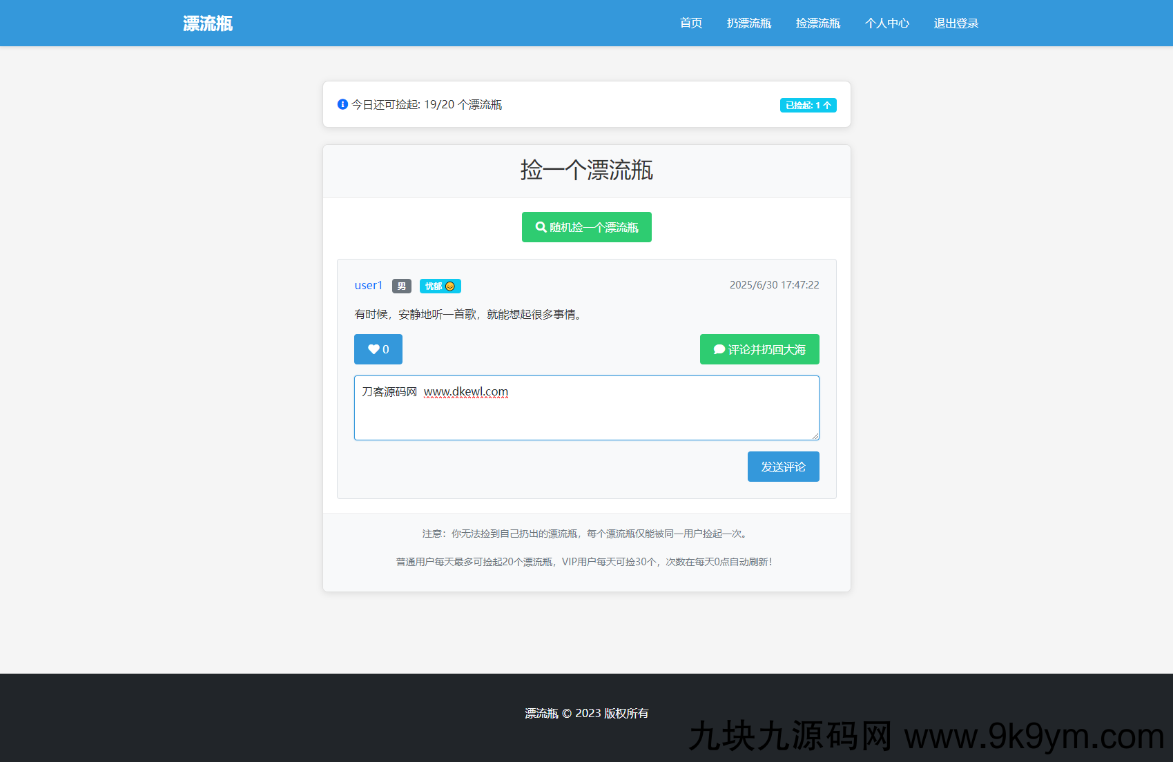 全新漂流瓶系统源码 全开源 新UI 附安装教程 亲测可用