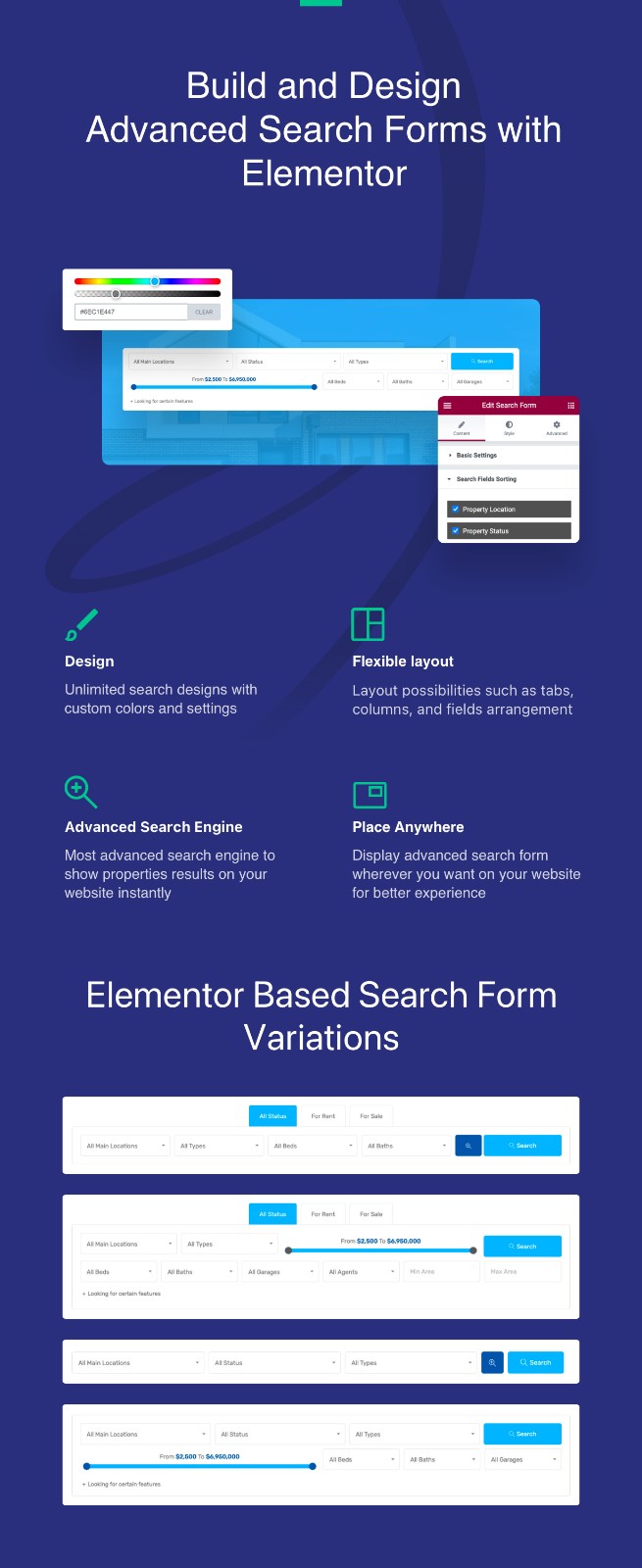 You can show/hide any field in the search form, you can add new fields to the search form, and you can customize the data displayed in those fields. You can show multiple location fields. You can change the minimum and maximum price values. You can change the search behavior and values for the Beds and Bathrooms fields. In short, you can customize the search form to suit your needs. The RealHomes theme also includes an Elementor widget for a real estate search form that is fully customizable. If you plan to use your website for property bookings, activating the Vacation Rentals plugin (which is included for free) will convert the default property search form to the Vacation Rentals search form.