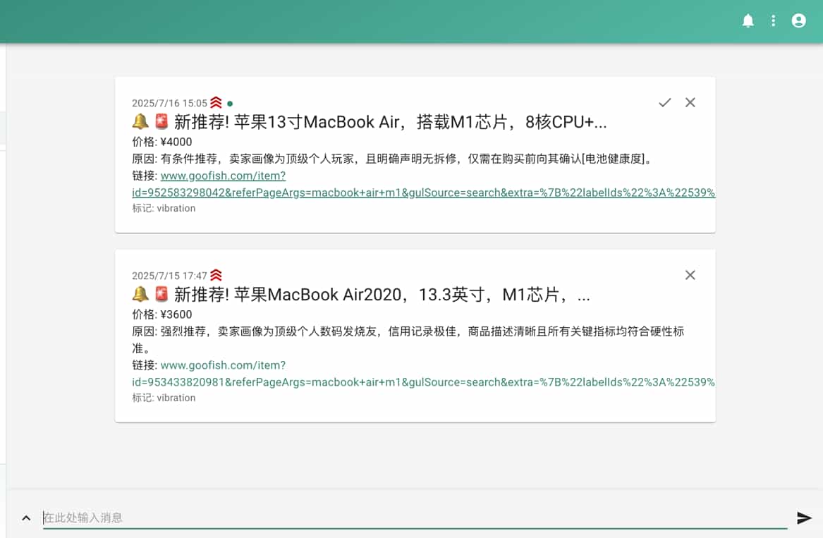 即时通知: 支持通过 ntfy.sh、企业微信机器人和 Bark,将符合AI推荐的商品立即推送到你的手机或桌面。