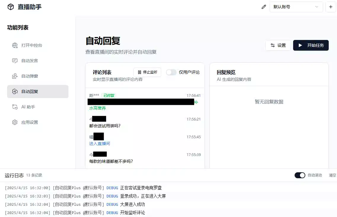 AI 自动回复:实时监听直播互动评论(包括进入直播间、点赞、关注、加入品牌会员、加入粉丝团、下单信息等)、自动生成回复内容(仅限抖音小店/巨量百应)