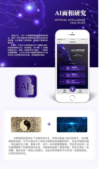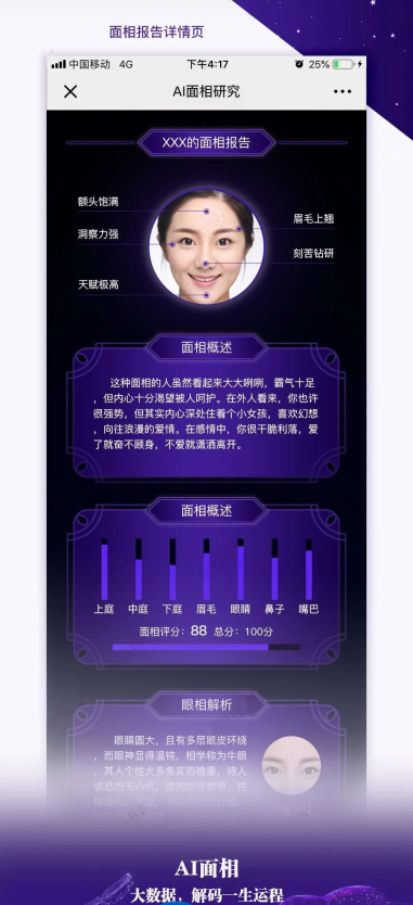 AI面相系统可以通过你上传的清晰正面、五官清晰、不戴眼镜、面部完整显现、无刘海遮挡照片,先进行扫描照片面部特征,头部姿势、左眼状态、右眼状态无误,再通过云计算智能分析,测量三庭长度、定位五官、综合分析,最后传送给你一份非常清晰明了的面相情况总结。详细具体到五官上庭、中庭、下庭、眉长、眼睛、鼻子、嘴巴、参数及评分,反馈出面相具体情况如五行面相、五行格局、流年运势,给你完整的面相事情运程报告、面相情感运程报告。这些分析结果你可以形成一张面相报告,分享给你的好友。微擎模块小程序系统!
