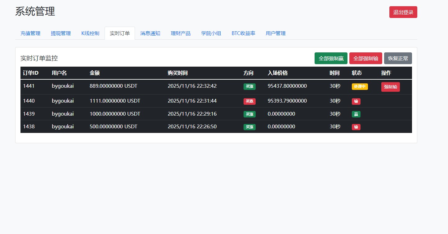 主要测试了k线行情控制、用户输赢控制、订单输赢控制,非常好用,各个功能都正常,还有代理功能