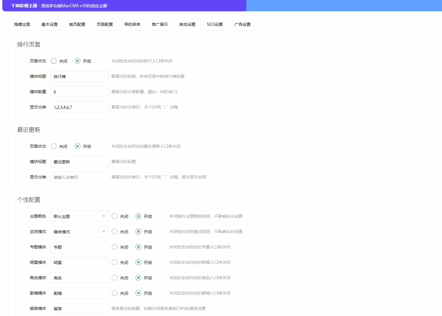 后台点开自定义菜单配置 在最下方添加:主题设置,/admin.php/admin/conch/theme