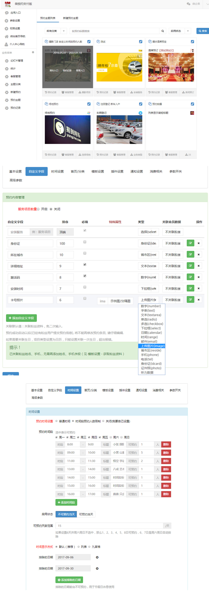 微预约支付版是一款可以自定义表单模型,基本上所有行业都能用:预约、报名、订单等场景的微信模块。