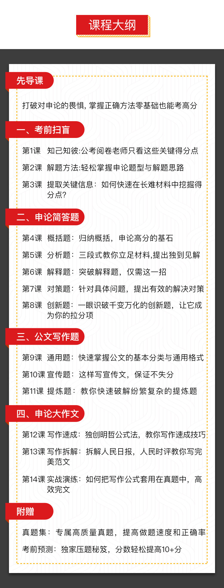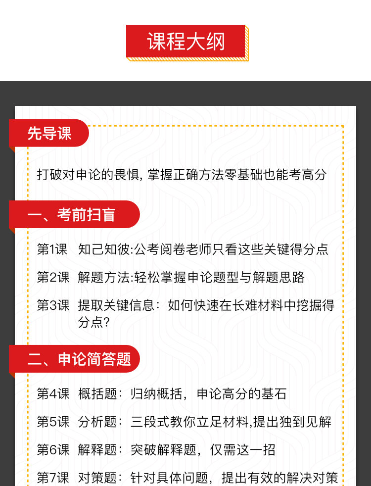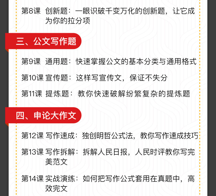 课程分成四大板块,分别是考前扫盲,简答,公文,大作文3大板块重点突破,还附赠了真题集,帮你提高做题速度和正确率。