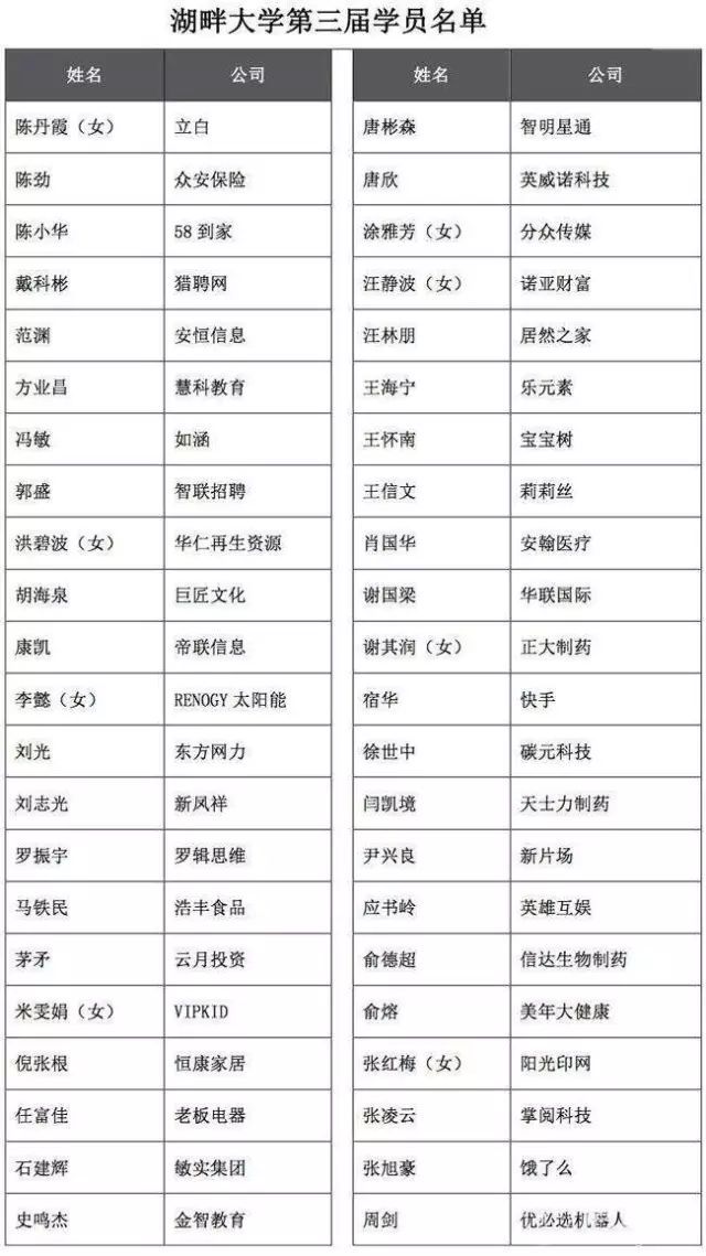 在第三期湖畔学员名单中,包括饿了么创始人张旭豪、快手创始人宿华、VIPKID创始人米雯娟、立白集团董事陈丹霞、老板电器总裁任富佳、英雄互娱创始人应书岭、罗辑思维创始人罗振宇等。