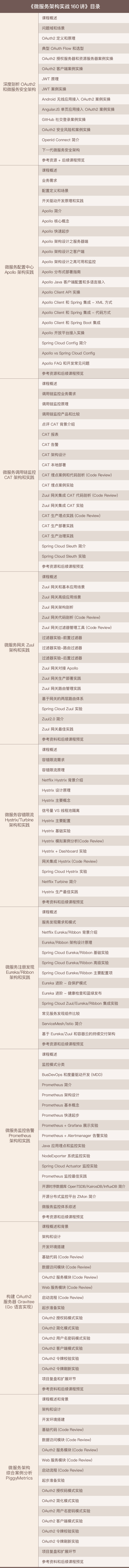 课程内容以 Spring Cloud 技术栈为基础,同时融合了其他国内知名的开源组件,分 8 个模块讲完,每个模块专注讲解一个微服务架构的核心组件,用户可以利用碎片时间自由学习,快速掌握微服务核心组件的业务场景、架构原理和开发运维实践。