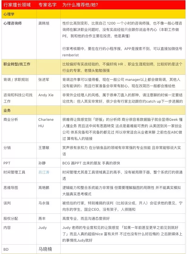 这些专业人脉成为了一份详细的表格,他通过这个方法,迅速认清自己面临买房、保险、行业咨询过程的风险,大大降低时间损耗。