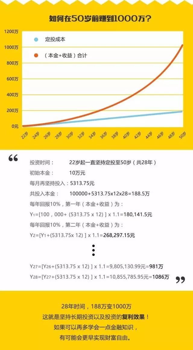 子鱼按照上面的方法算了一下,确实到了50岁能赚到1000万,而且就算刚开始没有10万,每个月定投5000元,28年后,也能赚到900万!